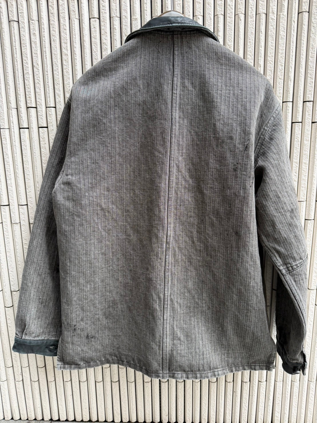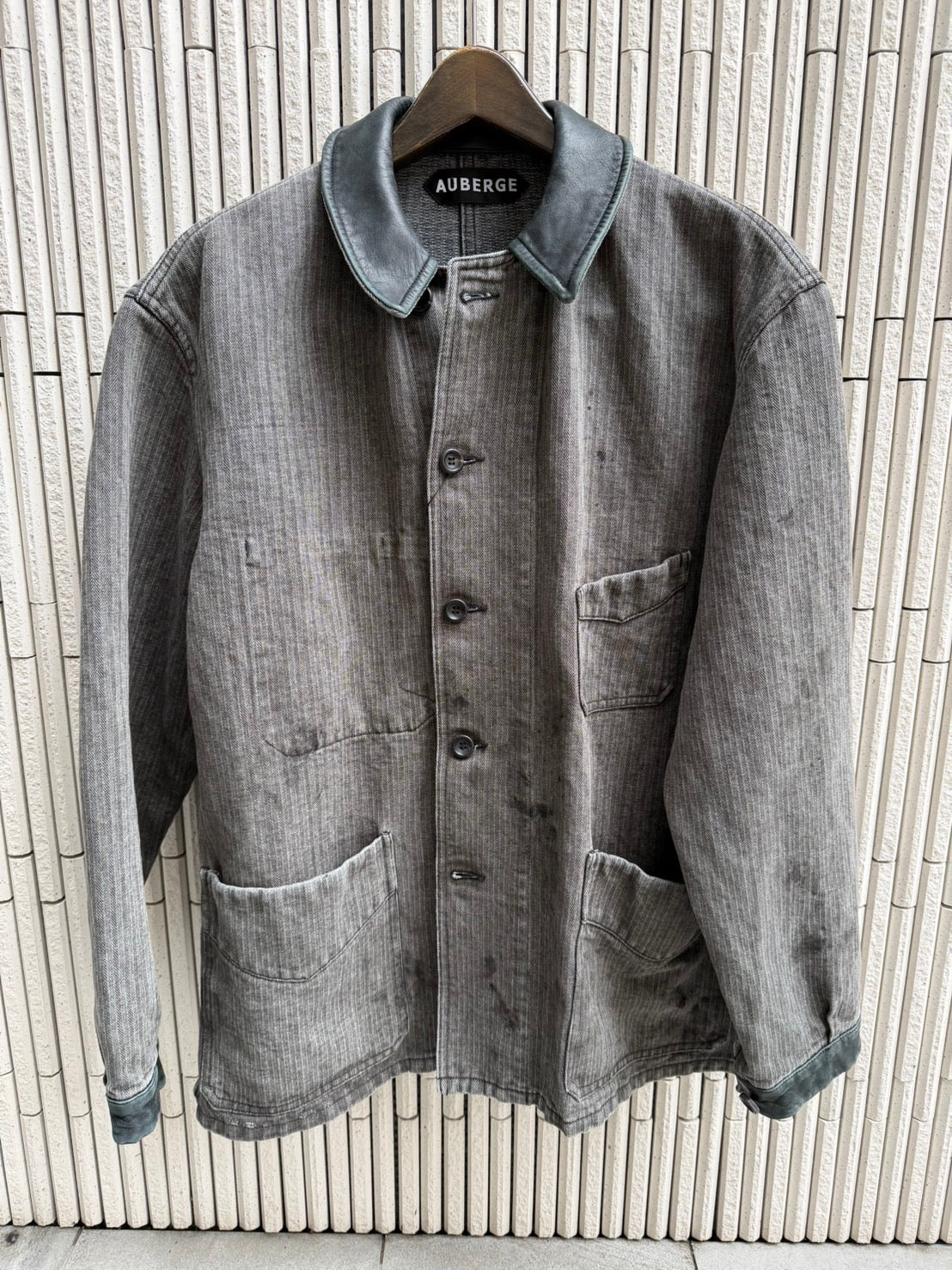 フレンチモールスキンによるカバーオールのイメージではありますが、襟、カフスにウォッシャブルレザーを使い洗い加工をハードに入れています。麻が入ることで独特のプリプリ感が出ると同時に、ビンテージなフレンチっぽさも醸し出します。豊和のリアルなユーズド加工も味を添えます。