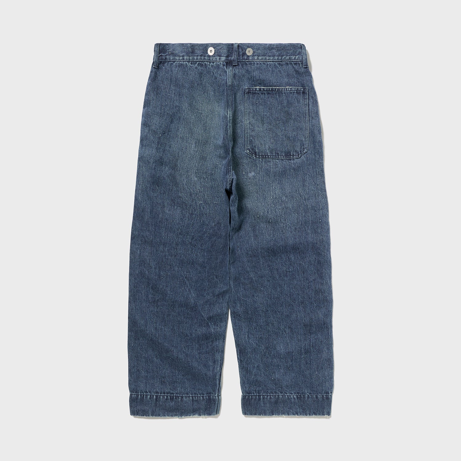 こちらもUKファブラム社のインディゴワークスラックスをデザインベースにしております。シルエットはAUBERGEの41チノに近いワイドバギータイプで素材の迫力と相まって存在感のある1本です。加工は岡山・豊和でのスーパーリアル洗い。