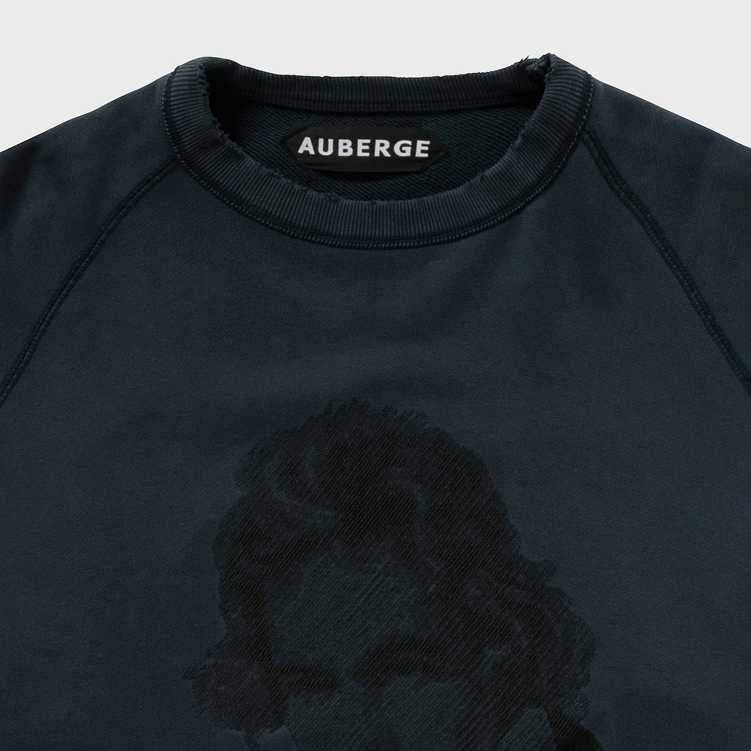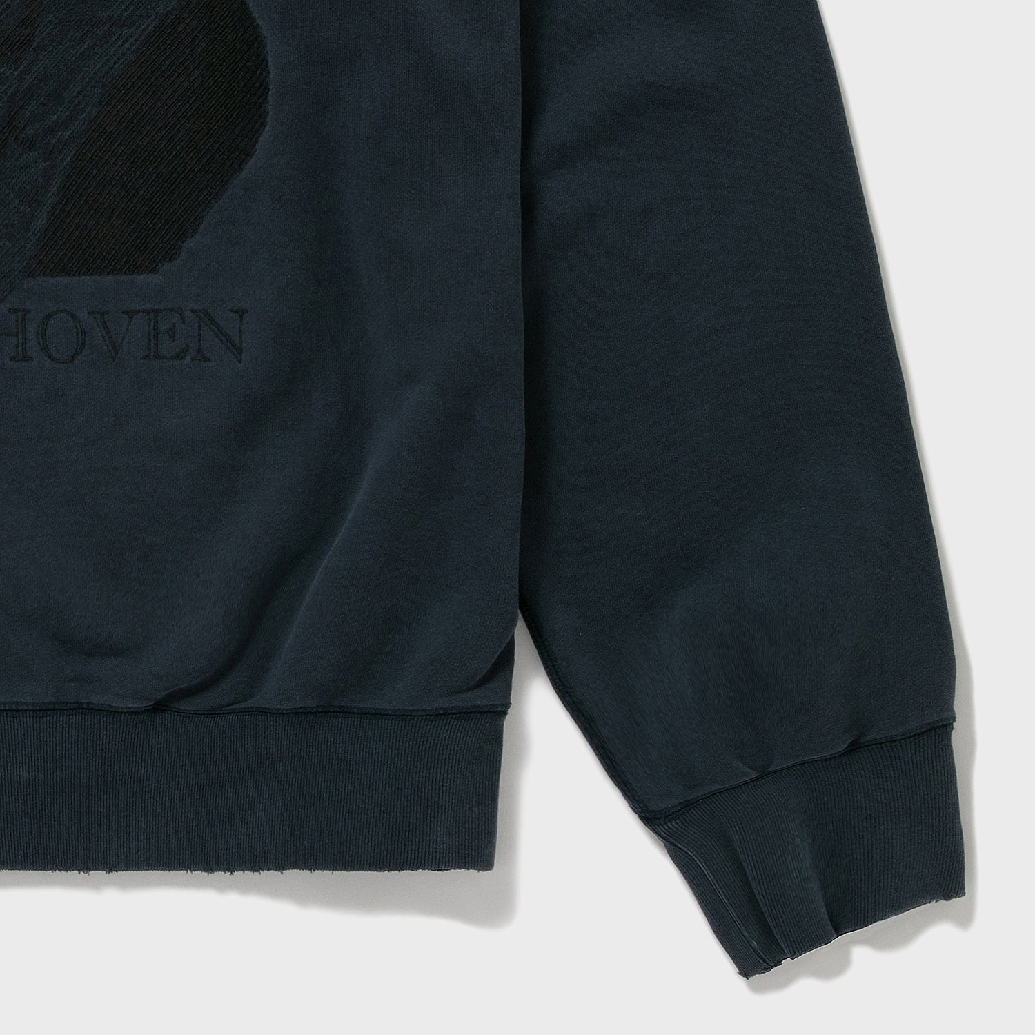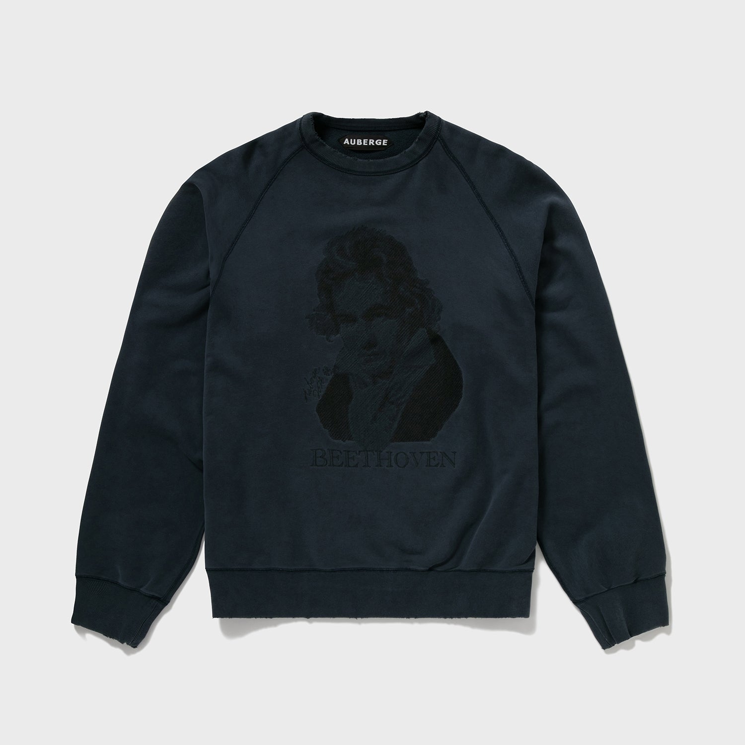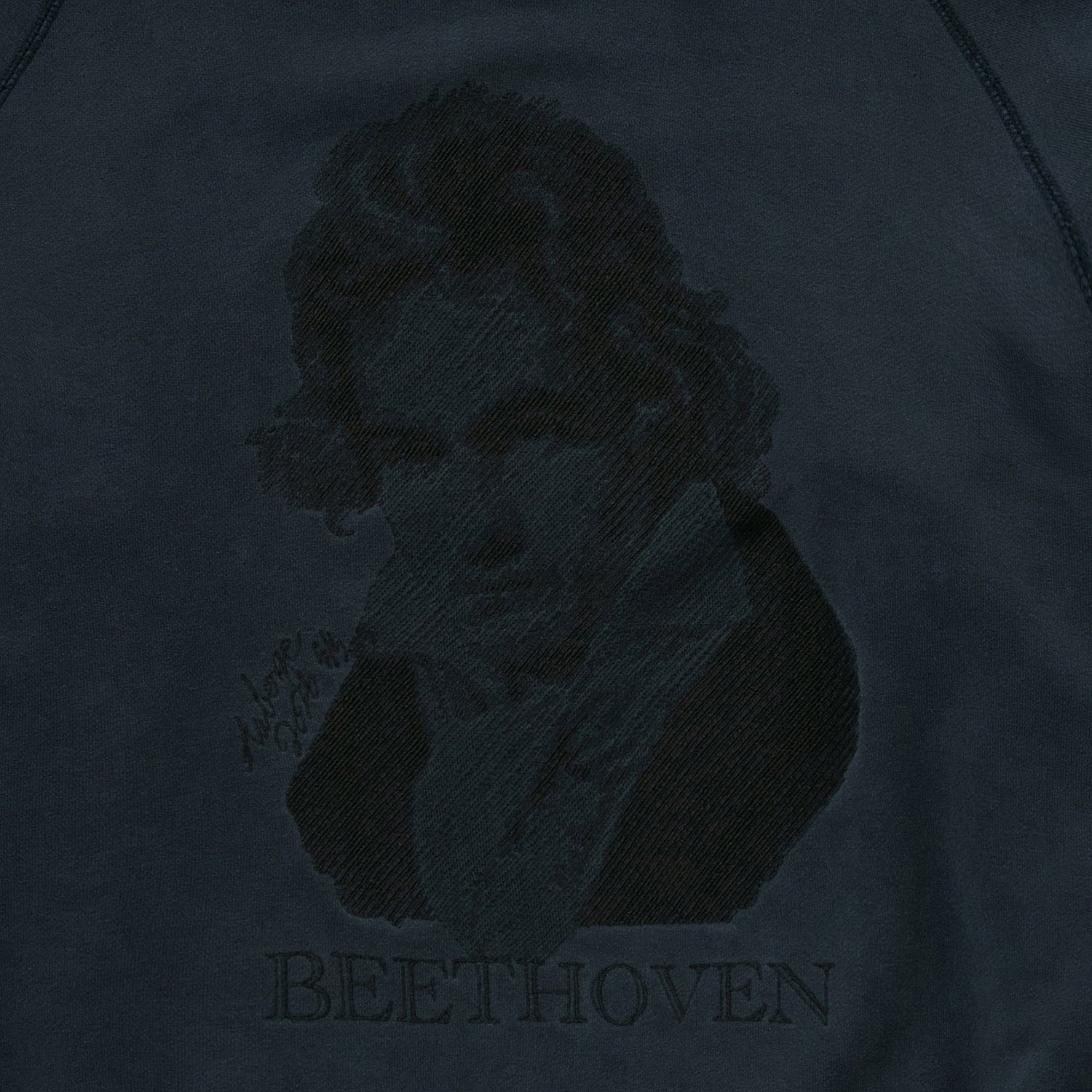 胸元のベートーベンはなんと刺繍で表現されている。これはAUBERGEがしばしば採用する写真画像を地震計の針のような動きで再現する桐生の刺繍工場の技術である。ちょっとレトロでアート感あふれる仕上がりが毎回気に入っている。ちゃんとこの画像に関してプロダクトライセンス料を支払っての使用である(笑)。あえてベートーベンにしたのは、数多のブランドがこのモチーフに挑み、たいてい刷るだけの中で、このモチーフをジャズスタンダードの名曲に見立てAUBERGEならこう演奏する、そんな気分のアプローチなのである。なので有名スタンダードネタである必要があった。